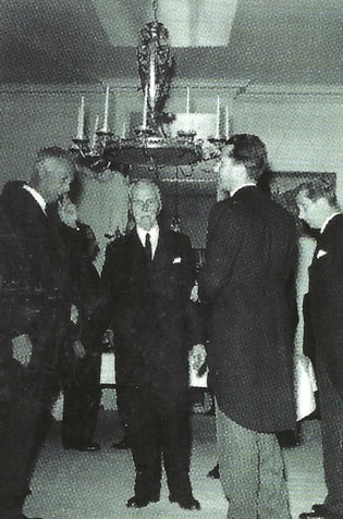 Le comte André de Meeûs, frère cadet de Francis, accueillant Léopold III, le roi Baudouin et le prince de Liège, futur Albert II, au Stuyvenberg en 1965 pour les funérailles de la reine Elisabeth. Il était le Grand-Maître de la Maison de notre troisième souveraine.