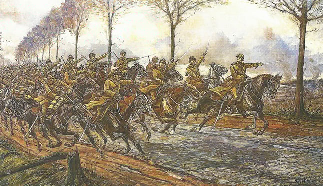 La charge de Burkel (1918) au cours de laquelle le commandant Francis de Meeûs tomba (Musée royal de l’Armée).