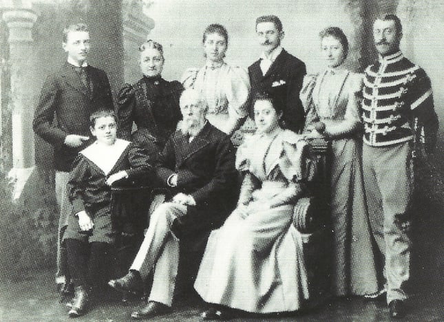 Le comte Eugène de Meeûs (1834-1915) et les siens. De gauche à droite, debout : son fils André, son épouse née Marie-Charlotte du Couëdic de Kergoaler, sa fille Juliette (baronne William del Marmol), Albert, Cécile (qui entra en religion) et Francis (qui mourut lors de la charge de Burkel). Entourant leur père : Tony et Thérèse (baronne Edmond de Moffarts).