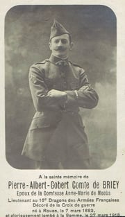 1°) Comte Pierre de Briey, lieutenant au 16ème dragons, chevalier de la Légion d’honneur à titre posthume, croix de guerre française (1882 et mort pour la France en 1918), fils de Florimond de Briey, colonel de cavalerie et de la comtesse Marie d’Aspremont Lynden.